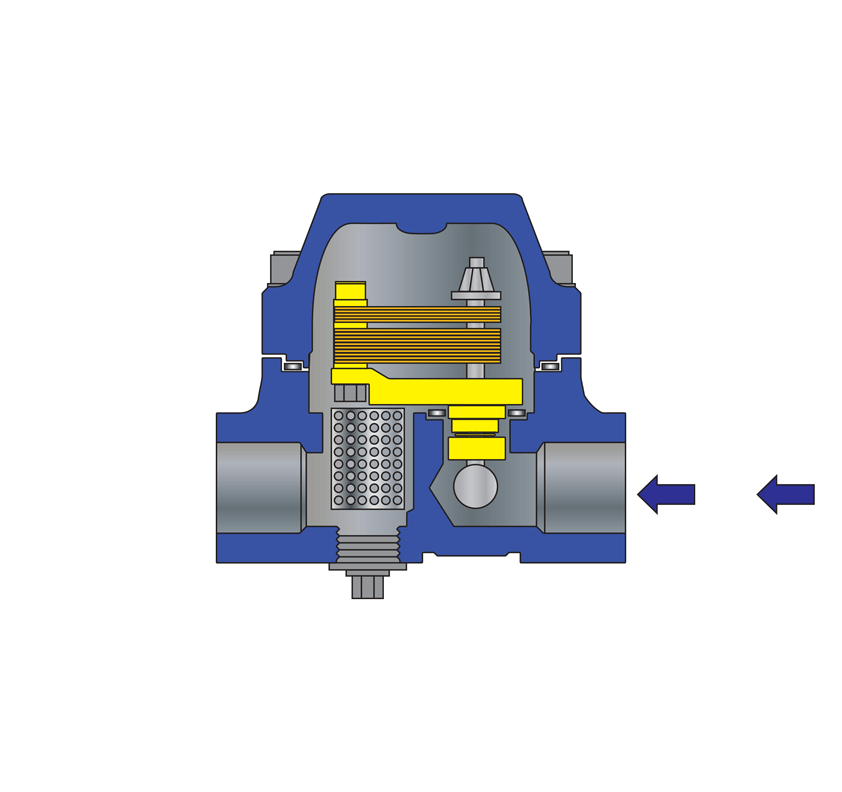 Cross-sectional diagram of a steam trap, showing internal components such as the valve assembly, and bimetal element, with flow arrows illustrating how it reacts to backflow.